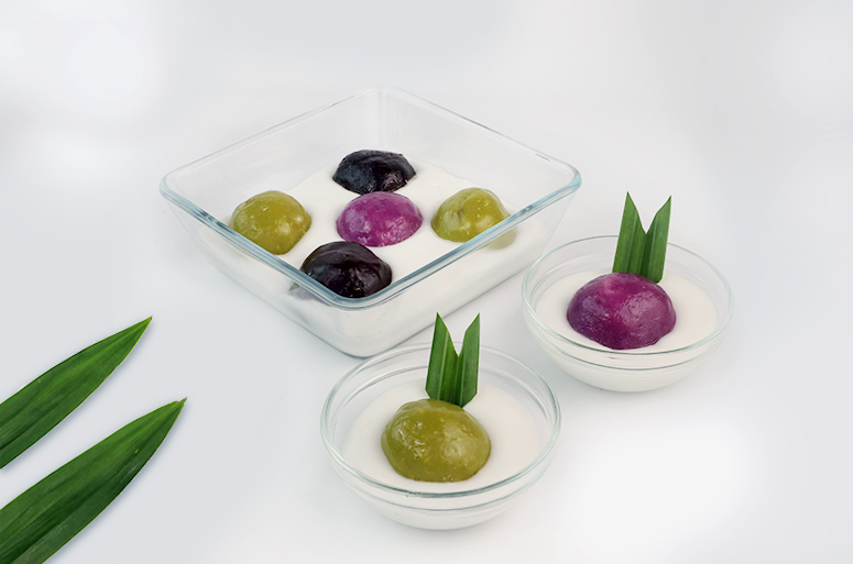 Bagi 3 adonan, masing-masing beri pasta pandan, pasta taro dan pasta coklat