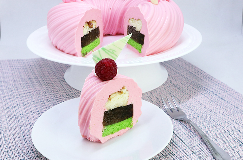 - Lalu masukkan adonan merinque, jahe jelly dan sponge dan kemudian tutup dengan adonan santan mouse hingga Loyang penuh dan tertutup rata.