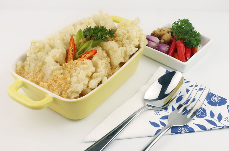 Tuang adonan yang masih panas ke campuran tepung lalu aduk perlahan